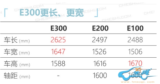 宝骏E300车身长宽高分别为2625×1647×1588mm,车长和车宽从E100到E300逐步增加,车身高度则逐步降低,尽管E300轴距参数并未公布,但综合来看,轴距也有望为1600mm。动力方面,E300搭载的三元锂电池最大功率为29kW,与E100、E200保持一致。此外,新车提供第二排单人座椅,倒车影像系统,驾驶辅助系统、前组合灯(集成日间行车灯)等配置。