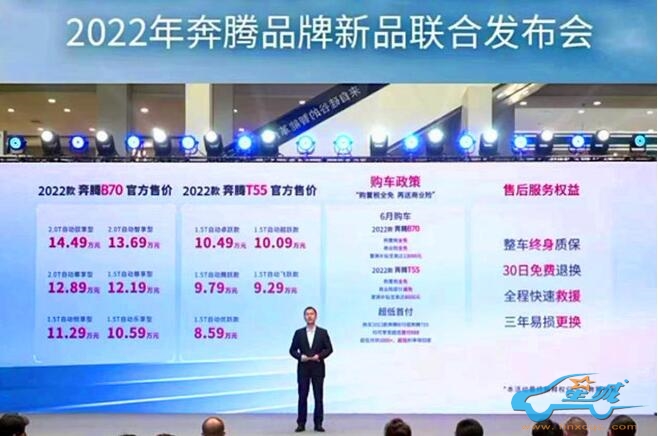 同时为了响应国家减半征收车辆购置税等促进汽车消费的新政策,一汽奔腾还特别推出“购置税全免 再送商业险”的购车政策。2022年6月内,2022款奔腾B70享有购置税全免+商业险全免,置换补贴至高达13000元。2022款奔腾T55享有购置税全免+商业险部分减免,置换补贴至高达8000元。两款产品均可享受超低首付888、超低月供1000+、超低利率带回家。用户购车均可享售后服务权益,包括整车终身质保、30日免费退换、全程快速救援、三年易损更换等。