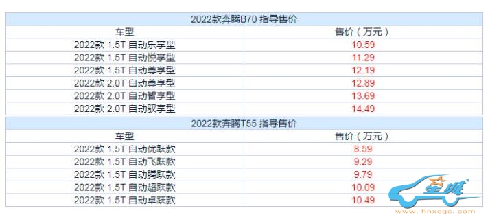 一汽奔腾“新国民双子星”焕新上市,2022款奔腾B70,售价10.59万元-14.49万元;新增超10项智能及安全配置,智能进化安全加倍。2022款奔腾T55售价8.59万元-10.49万元;入门既高端,1.5T高效发动机、D-life 5.3物联系统、12.3英寸中控大屏等科技配置,享受超越同级的驾乘享受!