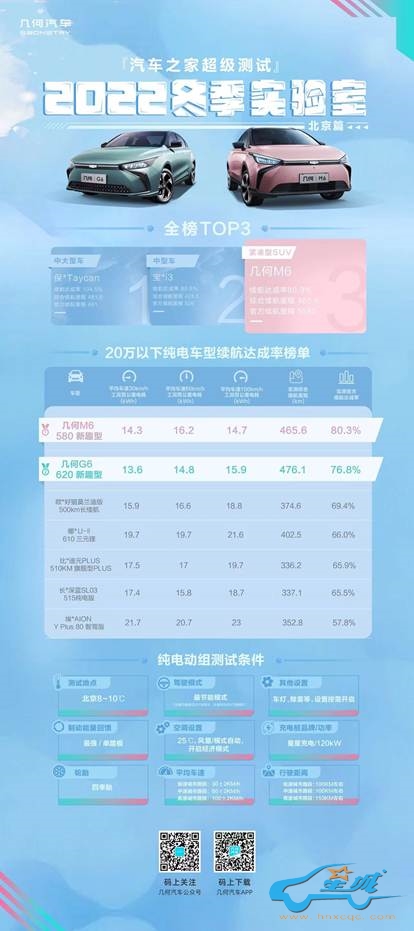 作为新能源市场少数的“实战派”,几何M6/G6在汽车之家2022冬季实验室中,分别斩获20万以下组别续航达成率的冠亚军。在总榜中,几何M6以80.3%的续航达成率,与保时捷、宝马共同跻身冬测榜TOP3,再一次夯实了真续航的产品标签。