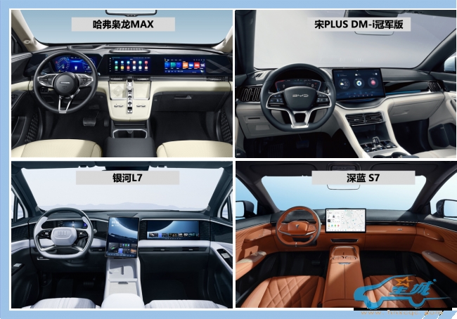 作为哈弗品牌最新的新能源作品,哈弗枭龙MAX的外观设计很时尚,前脸配备渐变式的无边界格栅,让前脸更具科技感。一体式集成前大灯及尾灯,线条简洁锐利,整体辨识度很高。银河L7的外观采用了涟漪设计语言,沉稳又不失时尚感,给人眼前一亮的感觉。相比之下,宋PLUS DM-i冠军版和深蓝S7的设计缺乏新意,两者都采用了家族的设计语言。综合来看,哈弗枭龙MAX的外观稳重大气、更符合家用SUV设计理念,能符合大多数国人的审美。