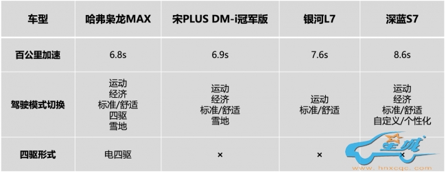 此外,哈弗枭龙MAX零百加速时间为6.8秒,媲美3.0T级别的燃油车,动力表现上也更胜一筹!相比之下,银河L7的百米加速没有优势,操控体验感不佳;而相比深蓝S7的增程式混合动力,在燃油经济性会略逊一筹;而宋 PLUS DM-i整体动力调校偏家用,再加上其底盘支撑性不足,整体的在动力和驾控体验上表现差强人意。