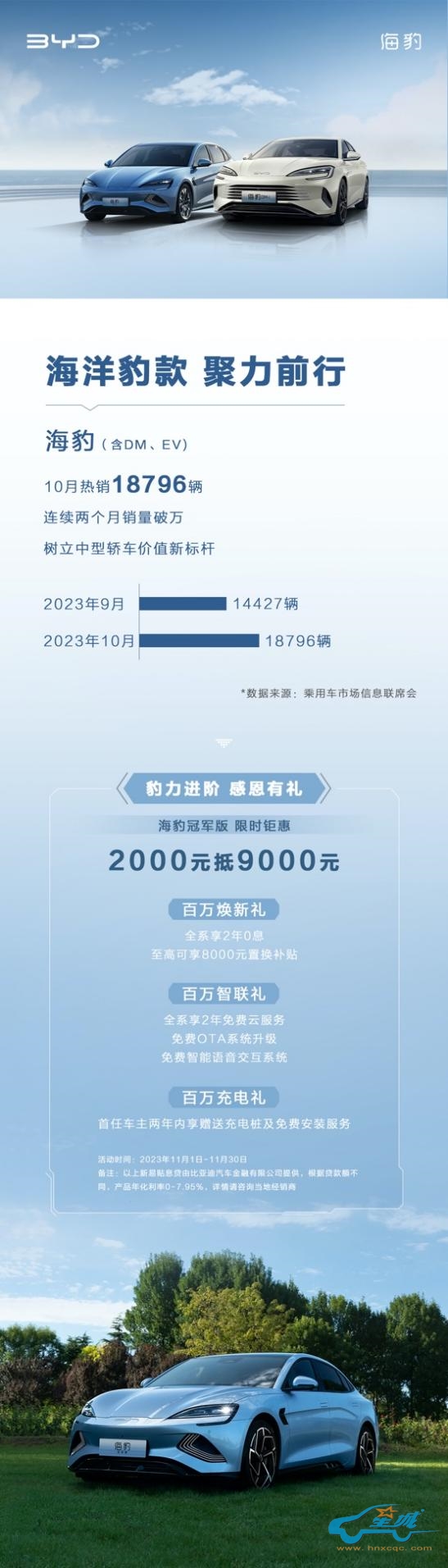 根据最新公布的销量数据显示,比亚迪10月乘用车销量突破30万辆,同比增长38.4%。比亚迪海洋网10月销量高达151749辆,再次刷新历史销量记录。旗下海豹车系成绩亮眼,10月共销售18796辆。其中,新一代主流中型轿车海豹DM-i10月强势破万,销量达11488辆,进一步稳固主流中型轿车价值标杆地位,加速中型轿车市场新能源化进程。