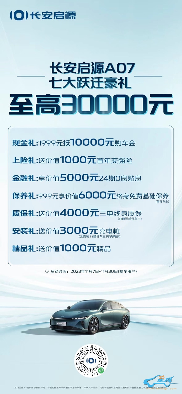 继10月30日,长安启源A07、A05开启大规模上市交付,随着“双十一”即将到来,长安启源为用户再送豪礼。11月7日—11月30日,购长安启源A07立享七大跃迁豪礼,至高30000元!