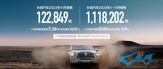 12月5日,长城汽车股份有限公司(股票代码:601633.SH,02333.HK,82333.HK;以下简称“长城汽车”)发布2023年11月产销数据。今年11月,长城汽车销售新车122,849辆,同比增长40.30%;1-11月,销量一路持续攀高,累计销量达1,118,202辆,同比增长12.94%。