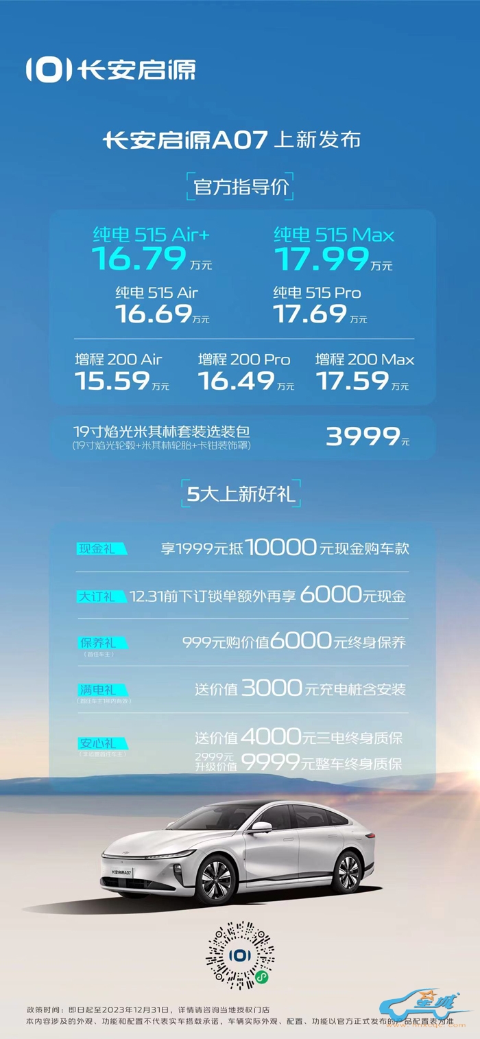 长安启源A07增程车型官方指导价为15.59万~17.59万元,长安启源A07纯电车型官方指导价为16.69万~17.99万元。同时,为了助力更多用户开启数智汽车新生活,实现向美好跃迁的愿望,长安启源A07新增车型还准备了5大上新好礼——现金礼:1999元抵10000元现金购车款;大订礼:12.31前下订锁单,额外再享6000元现金;保养礼:999元购价值6000元终身基础保养(首任车主);满电礼:送价值3000元充电桩含安装(首任车主1年内有效);安心礼:送价值4000元三电终身质保(非营运首任车主)、2999元升级价值9999元整车终身质保 (非营运首任车主)。
