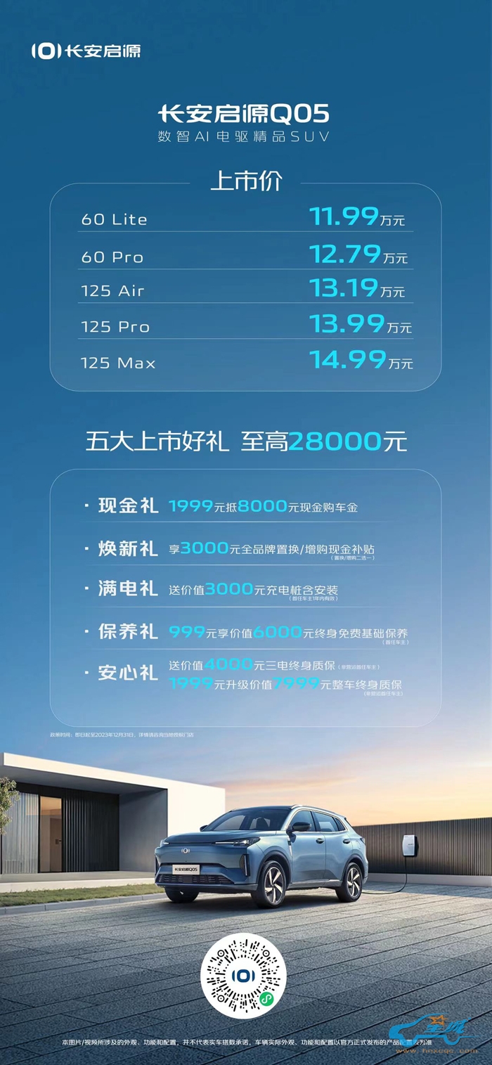 长安启源Q05官方指导价为11.99万元~14.99万元。为了让用户轻松拥有“数智电驱精品SUV”,感受“中国心”十佳数智电驱的魅力,长安启源Q05还推出5大上市好礼,包括:现金礼:1999元抵8000元现金购车金;焕新礼:享3000元全品牌置换/增购现金补贴(置换/增购二选一);满电礼:送价值3000元充电桩含安装(首任车主1年内有效);保养礼:999元享价值6000元终身免费基础保养(首任车主);安心礼:送价值4000元三电终身质保(非营运首任车主),1999元升级价值7999元整车终身质保(非营运首任车主)。