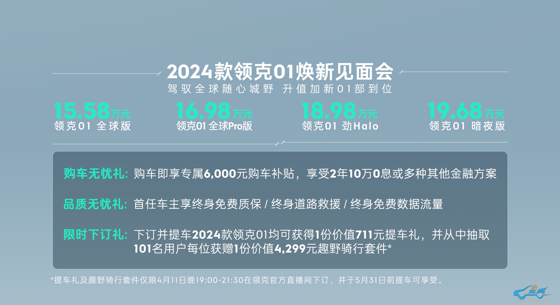 所有获奖用户请注意,为了确保您能顺利获得价值711元的提车礼包或价值4299元的趣野骑行套件(有机会可叠加使用,且骑行套件将通过抽奖形式发放),请您务必在2024年4月11日的晚上19:00至21:30期间,前往领克汽车的官方抖音直播间或者视频号,完成对2024款领克01车型的预定。并且,请保证在5月31日之前完成提车手续。按照这些步骤操作,您就能成功领取我们为您准备的精选礼品。
