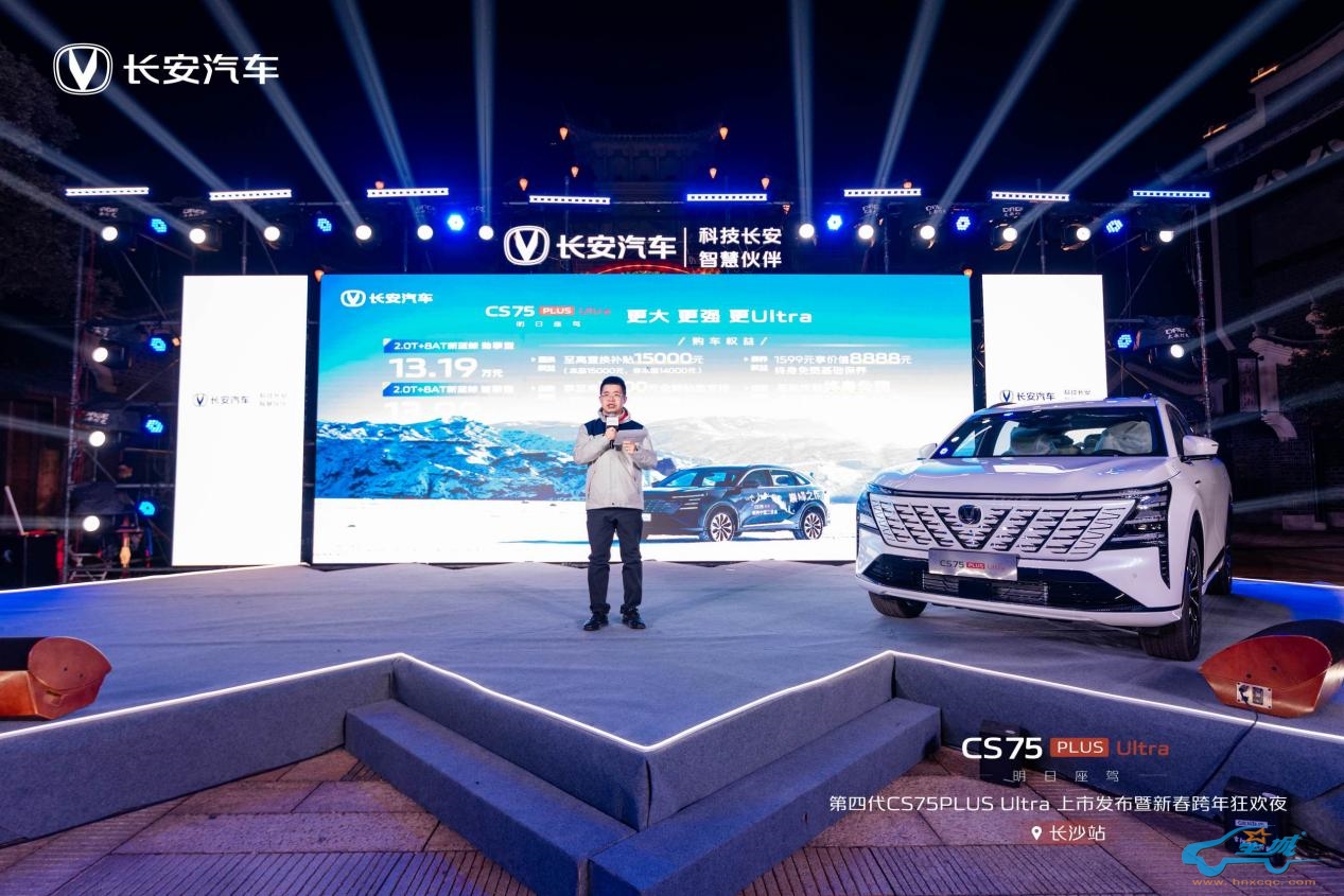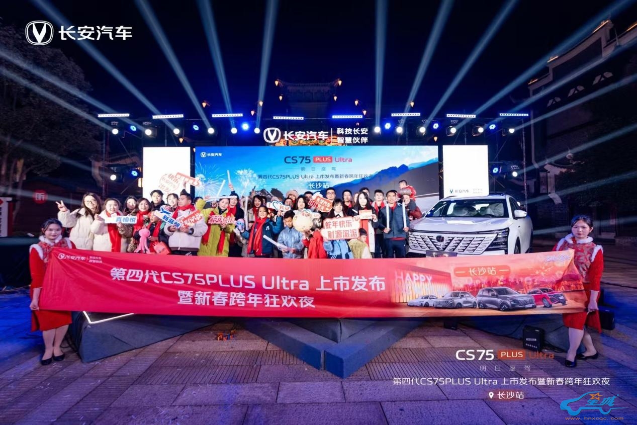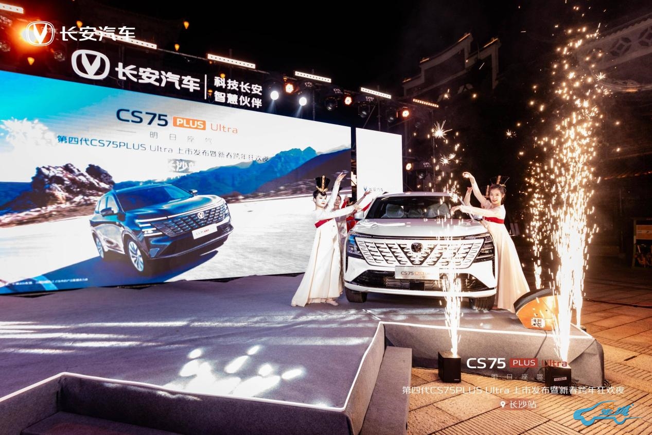 12 月 31 日,当新年的钟声渐近,星城长沙被一场汽车与文化交织的盛宴点亮——“明日座驾 再越巅峰 - 第四代 CS75PLUS Ultra 上市发布暨新春跨年狂欢夜”在长沙新华联铜官窑古镇盛大举行。活动现场星光熠熠,长安车主以及车迷朋友们齐聚一堂,共同见证第四代 CS75PLUS Ultra 震撼登场,在跨年之际掀起一阵新春购车狂潮。