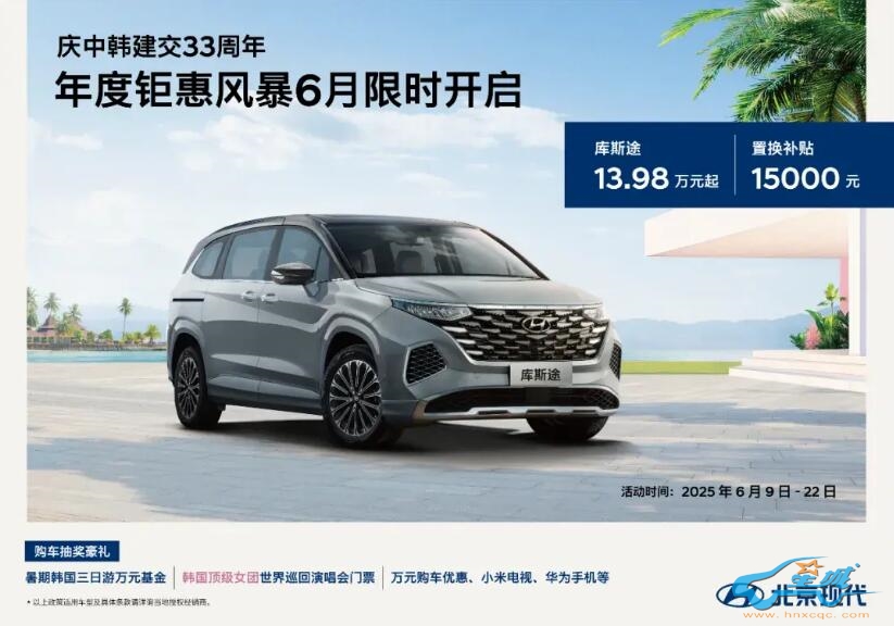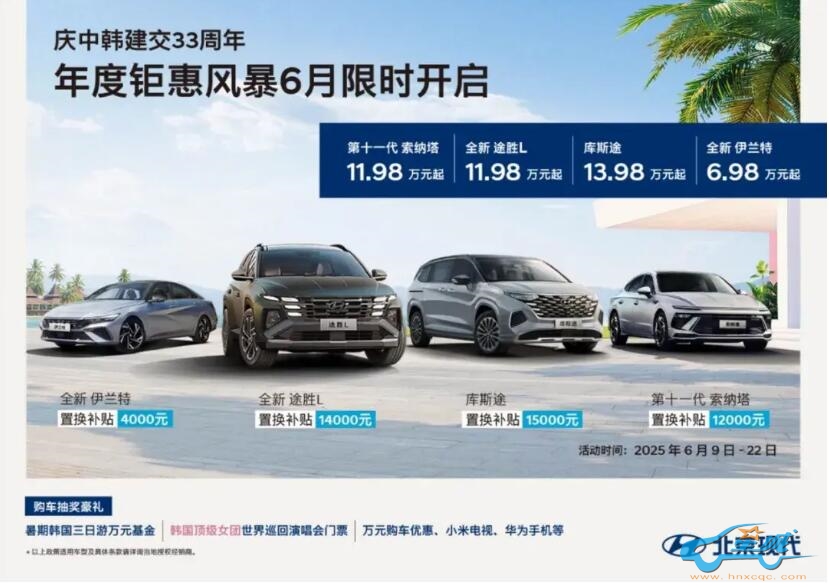 对于6月购车的消费者,北京现代准备了抽奖奖励,奖品 有300份“韩国三日游万元旅行基金”以及100张“BLACKPINK香港站演唱会门票”。即便不购车,消费者也能在北京现代官方小程序参与抽奖,只需支付1.88元,便有机会兑换小米75寸电视、华为Pocket2手机、10000元油卡+购置税保险大礼包等诸多好礼。