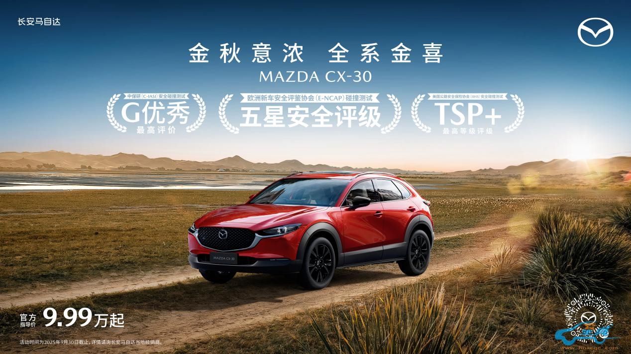 MAZDA CX-30全系直降3.2万元,焕新价9.99万起。CX-30自全球市场陆续投放以来,先后摘得欧洲E-NCAP五星安全评级、北美IIHS顶级安全评价、澳洲A-NCAP五星安全评级、C-IASI中国汽车保险安全指数6项全能全优「G」评价。安全性能全球如一,从不妥协。