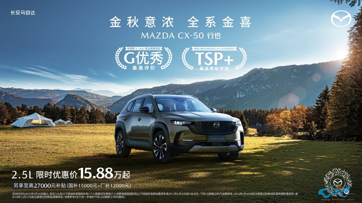 MAZDA CX-50行也自北美市场上市以来,就已获得北美IIHS“TSP+”顶级安全之选评级。在中保研测评中,CX-50行也在三大板块7项测试中均获得最高“G”优秀评价,更是同批次测评车型中唯一申请“乘员侧正面25%偏置碰撞”测试的车型,并再获“G”优秀评价,展现了其在安全领域“无死角”的高水准。活动期间,CX-50行也2.5L车型限时优惠价15.88万起,符合条件的用户置换购车至高可享12,000元厂补和15,000元国补,首任车主享终身免费质保。