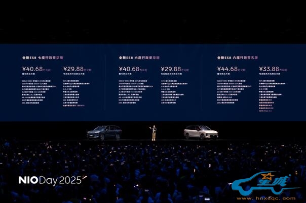 作为本次活动的重点车型,全新ES8实现了从平台架构到功能体验的全面升级。新车共推出三款配置车型,整车购买价格为40.68-44.68万元,电池租用方式购买价格为29.88-33.88万元,比预售价格低了1万元,全新ES8将于9月21日起开启全国交付。