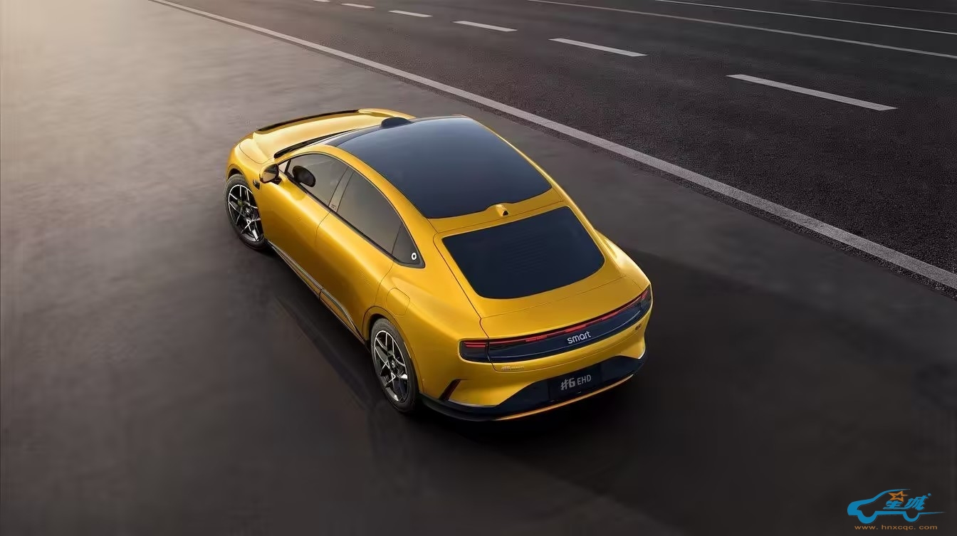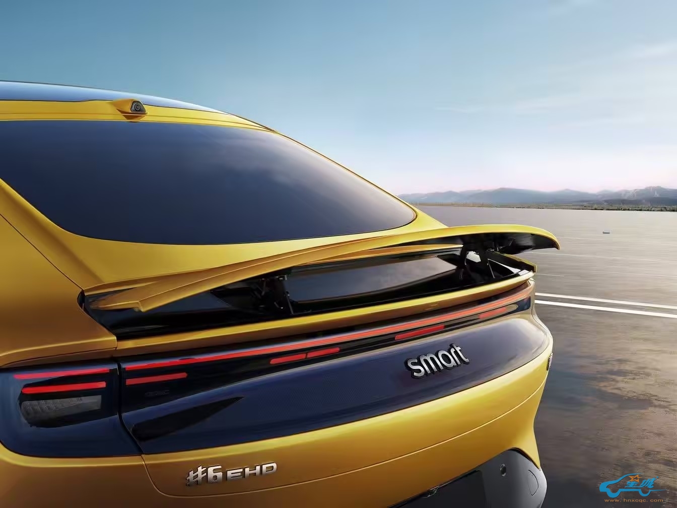smart精灵6号车身长度4906毫米,轴距2926毫米,整体尺寸与极氪007接近。门把手采用全隐藏电控式,车尾为贯穿式LED尾灯,并设计有可升降电动尾翼。